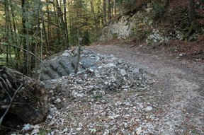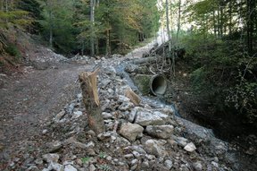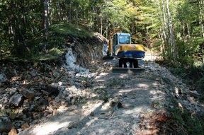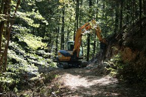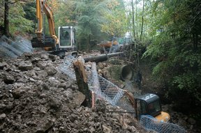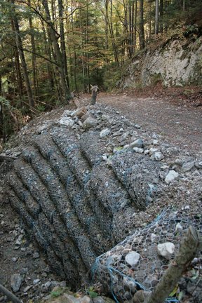 Während mehreren Wochen waren wir beschäftigt, die Schäden zu beheben. Das Kies in den Wiesen, rund 25 Kubikmeter, konnten wir mit eigenen Maschinen und Handarbeit entfernen. Doch für den grössten Schaden mussten wir externe Hilfe beiziehen. An einer Stelle musste die Strasse gegen den Berg verlegt werden, da die Böschung abgerutscht ist, weil das Wasser diese unterspült hatte. Und weiter oben musste eine Stützmauer aus Steinkörben hochgezogen werden.