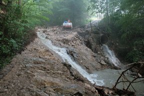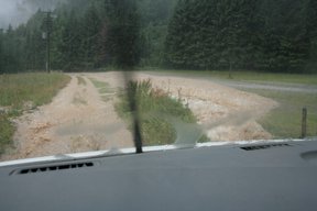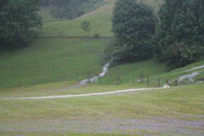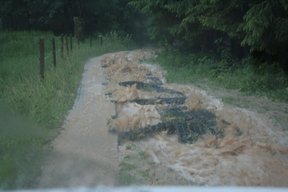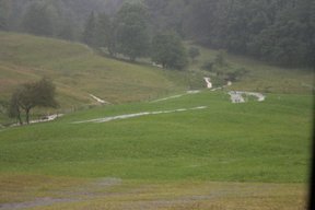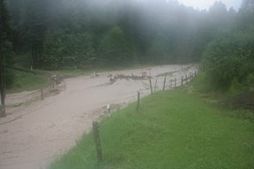 Begonnen hatte das Gewitter um ca 17.15 Uhr und dauerte gut anderthalb Stunden. Es goss aus allen Kübeln. Keine Brücke war den Wassermassen gewachsen. Wegen dem angeschwemmten Holz und Geröll, verstopften die Rohre. Das Wasser floss über die Strasse und spülte sie regelrecht weg. Es entstanden beträchtliche Schäden an unserer üblichen Zufahrt. Zudem schwemmte es auf einer Wiese beträchtliche Mengen Kies an, auf der wir am Vormittag das restliche Heu zusammentrugen.